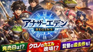 アナザーエデン ビギンズ(2026年夏予定)の発売日・対応機種(Switch2/Switch/Steam)・登場キャラを一次情報で整理。クロノトリガーのカエルやPSOキャラは出る?噂の真相、加藤正人の過去作品もまとめて購入導線つきで解説。