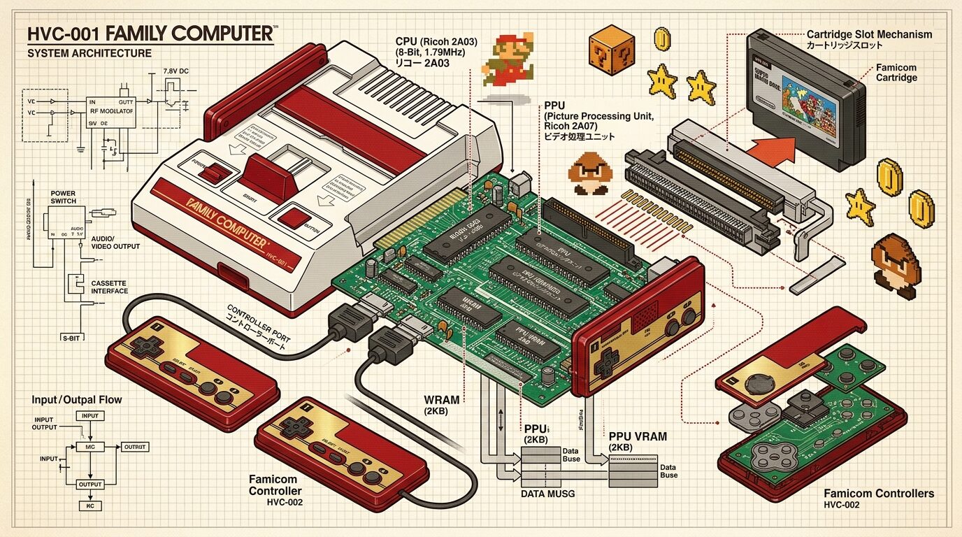 「ゲームなんて単純な機械でしょ」——そう思っているあなたは、ファミコンの内部を知ったら必ず考えが変わるはずです。1983年に登場したファミリーコンピュータは、ただゲームを遊ぶためのハードではありませんでした。コスト・性能・拡張性のすべてを極限まで研ぎ澄ませた、天才エンジニアたちの産物だったのです。