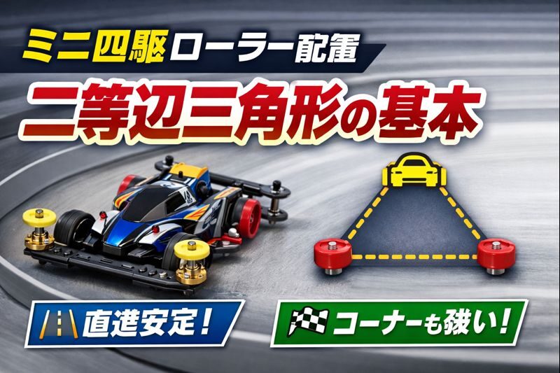 ミニ四駆を楽しむ上で、ローラーの配置はマシンの性能に大きく影響します。その中でも、「前1個、後ろ2個」のローラー配置で二等辺三角形を形成する方法は、初心者から上級者まで幅広く使われている基本技術です。本記事では、この配置のメリットや注意点、そしてバランスが悪いとどうなるかについて解説します。
