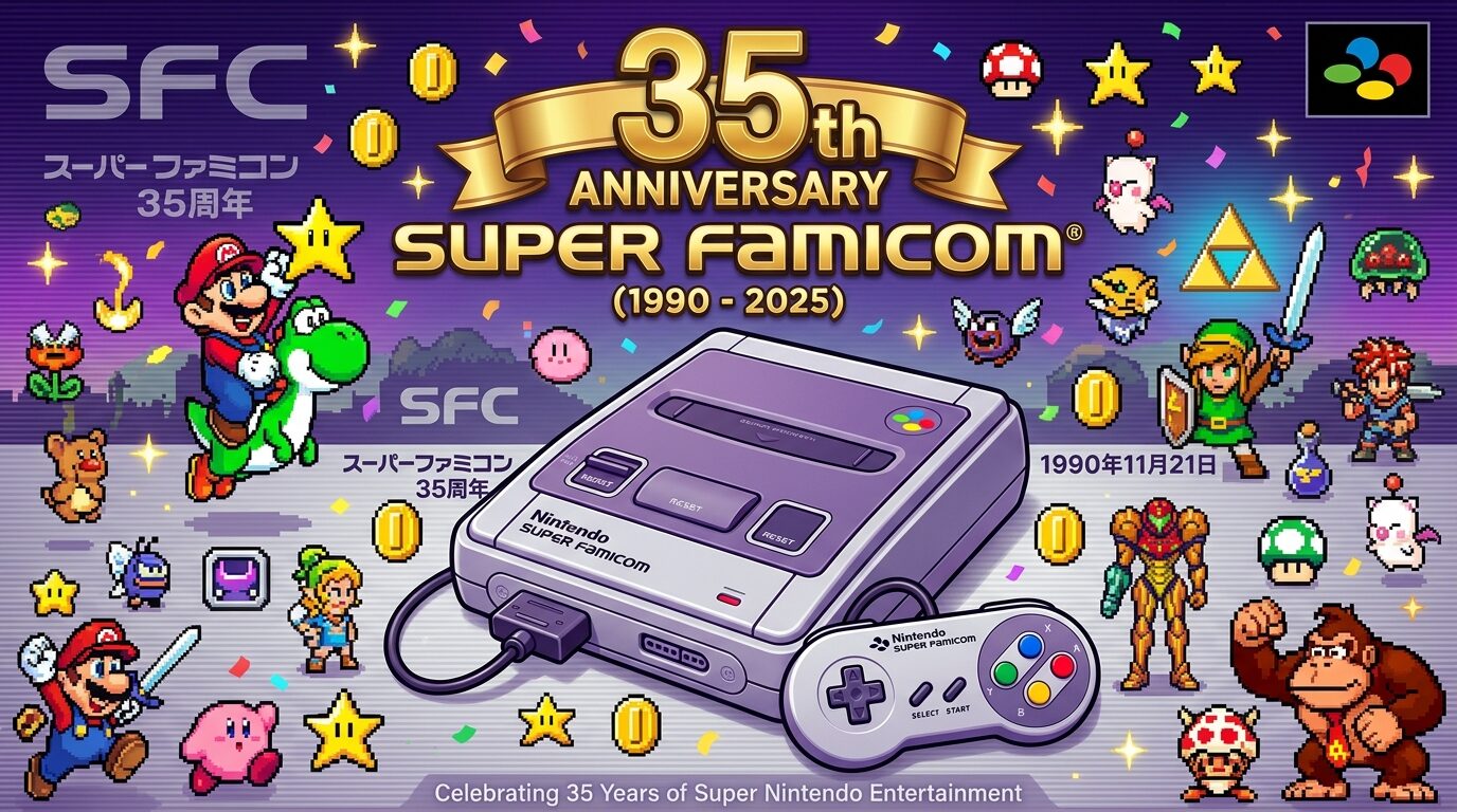 今でもNintendo Switch Onlineなどでスーファミのゲームを遊べる環境が整っている今だからこそ、その歴史的背景を深く知れば、プレイの楽しさは何倍にも膨らみます。スーファミ発売35周年を記念した動画の内容をもとに、その誕生の物語を丁寧に紐解いていきましょう。🎊