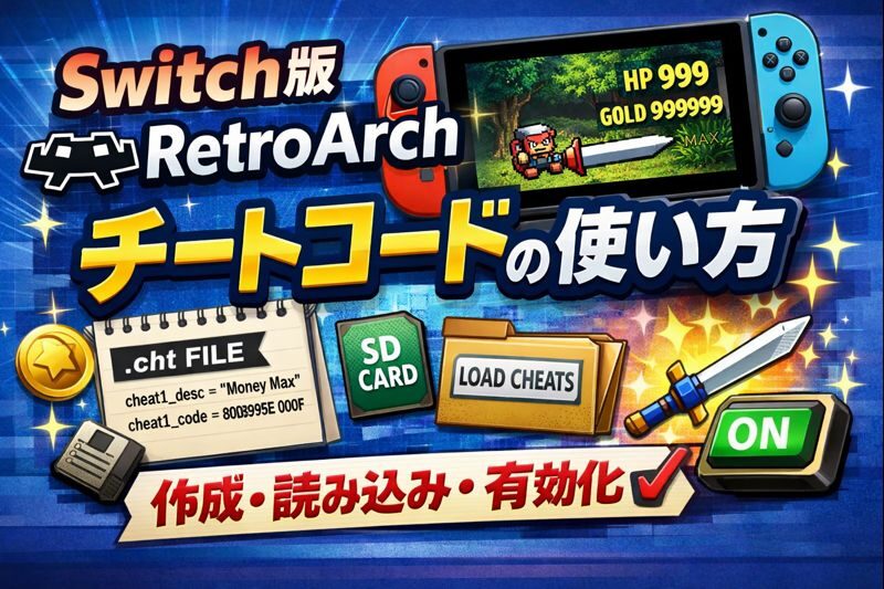 この記事では、Nintendo Switch上のRetroArchで チートコード(.cht)を作って読み込み、ONにするまで を、つまずきポイント込みでまとめます✅