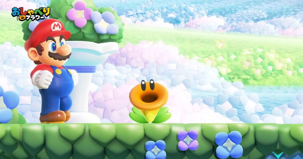 「おしゃべりフラワー」は、『スーパーマリオブラザーズ ワンダー』のフラワー王国に咲いている、自由気ままにしゃべる花🌼