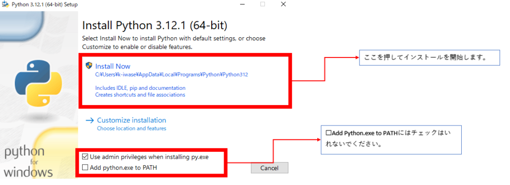 ※このとき「□Add Python.exe to PATH」にはチェックはいれないでください。