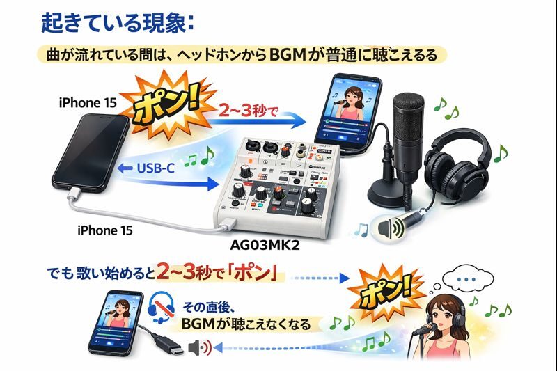 iPhone15 × AG03MK2で「歌い始めにポン→BGM無音→放置で復帰」は、