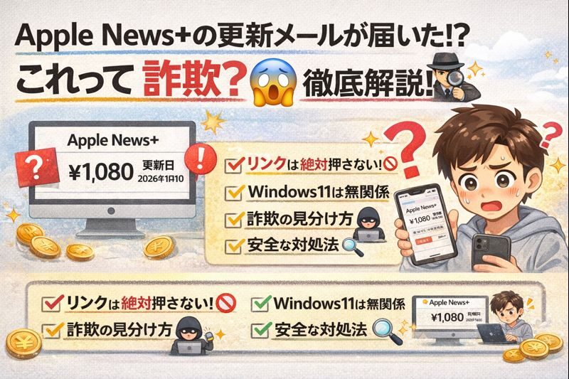 今回の「Apple News+更新メール」みたいに、**突然届く“それっぽい通知”**は誰でも焦ります😱📩