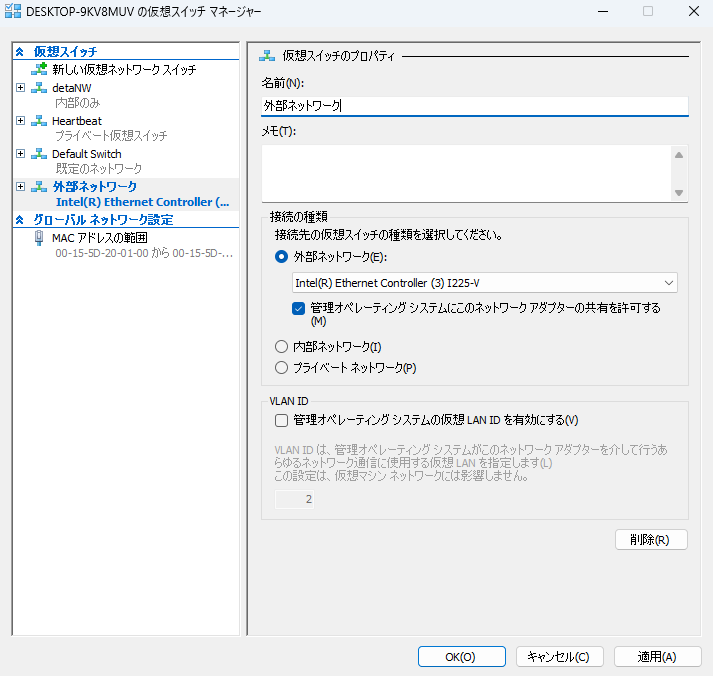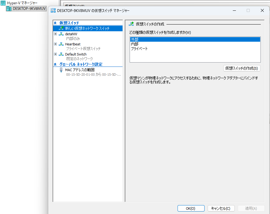 - Hyper-V マネージャー → 右側「仮想スイッチ マネージャー」→「外部」→作成。PC の実NICを紐づけ。Microsoft Learn