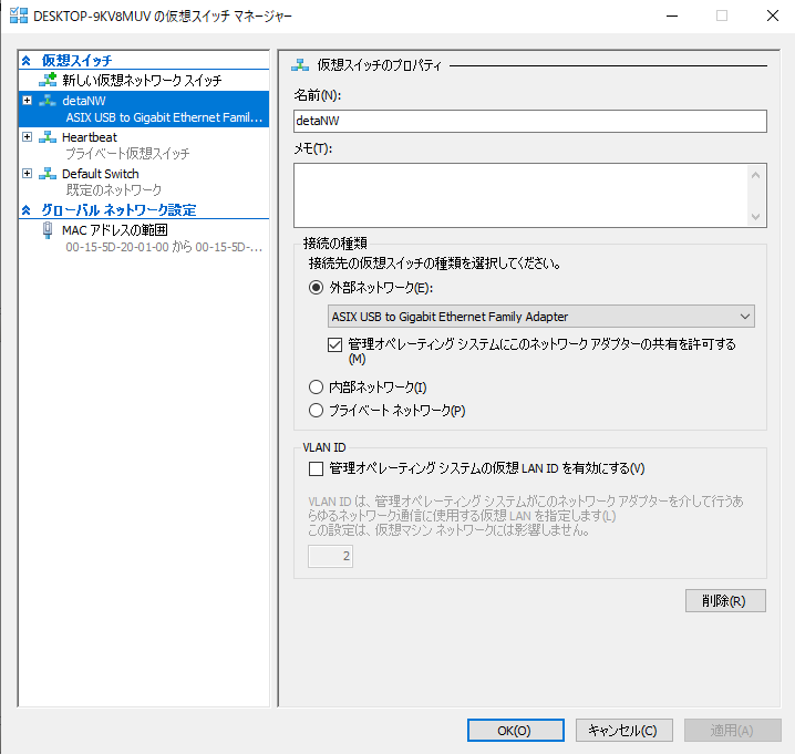 今回は、Hyper-Vや物理PC上のネットワークの設定について説明を記載していきます。