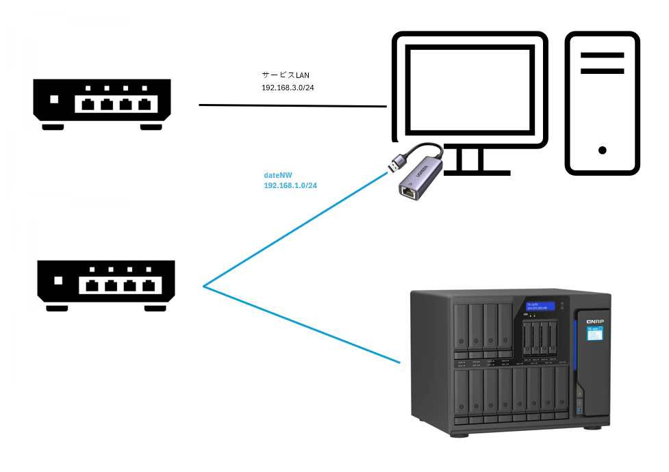 dateNWに当たる、ケーブルはUSB-LAN変換アダプターを使って増設しています。