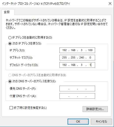 固定IPの設定をサービスLANのIPアドレスに設定してあげます。