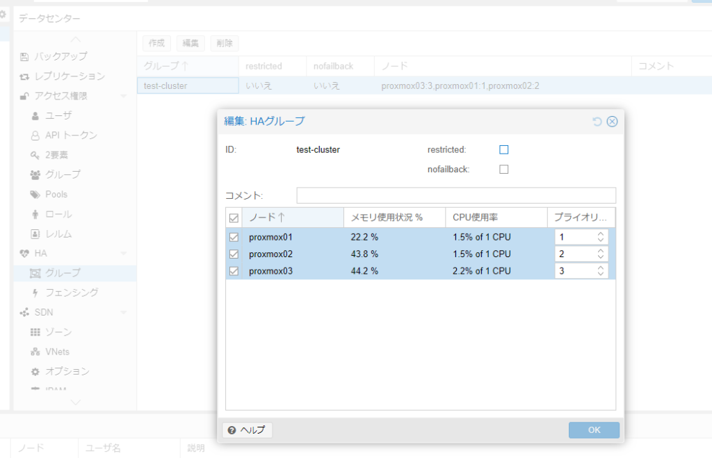 pvecm create my-cluster pvecm add <IP_ADDRESS_OF_FIRST_NODE> - HAリソースの追加: