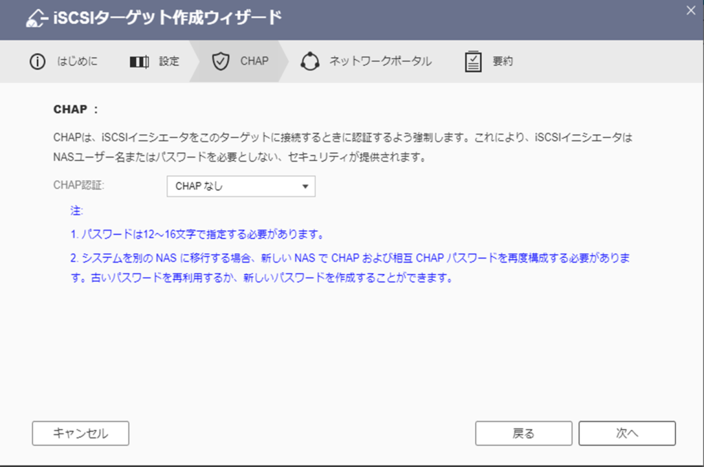 ※本番環境の場合は「CHAP あり」にした方がよいです。(パスワード付)