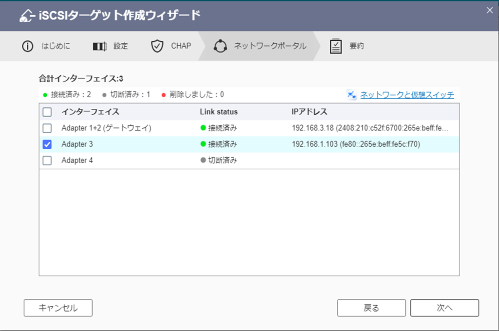 iSCSIの通信を行う、ポートを選択します。※ここではAdapter3を選択していますが、環境によって変えてください。