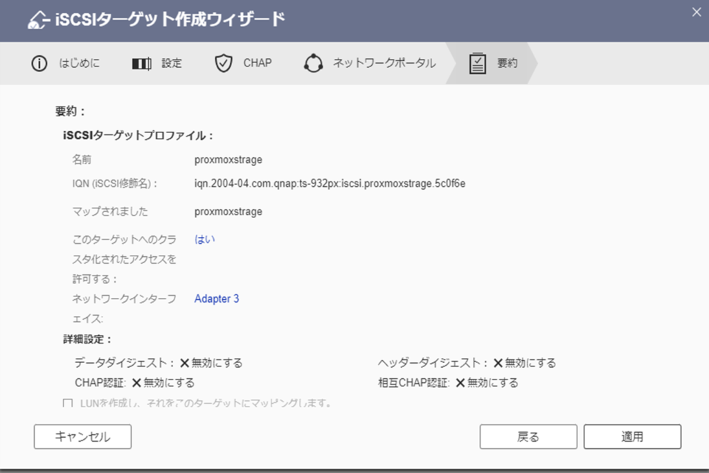 〇iSCSIターゲットにマッピングを選択して、先ほど作ったiSCSIターゲットを選択します。