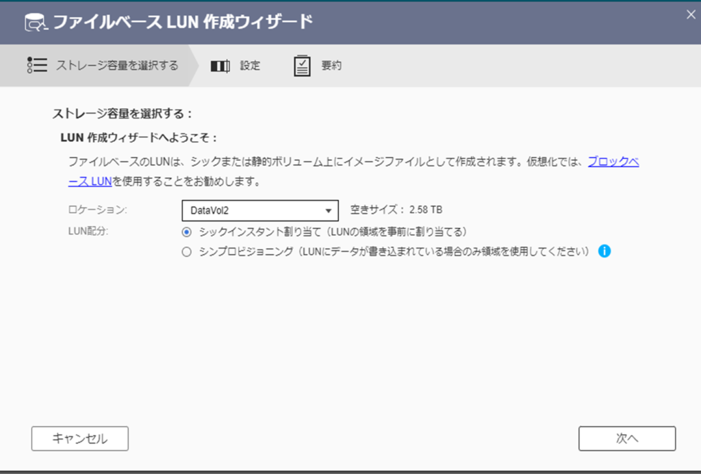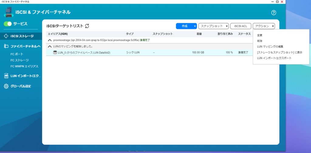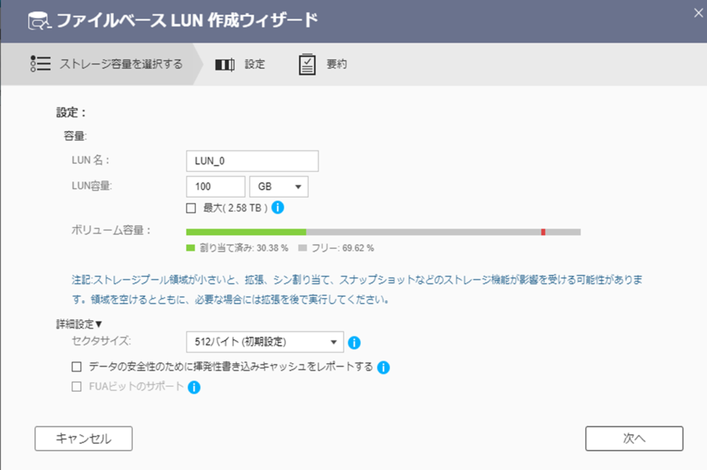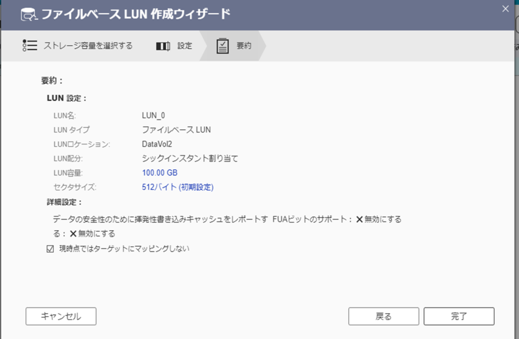 LUN容量:100GB ※あまり大容量である必要貼りませんので適当に。