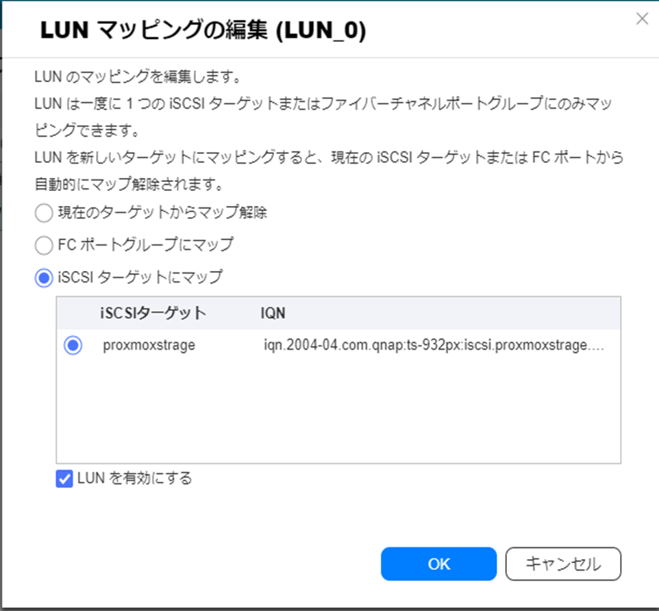 LUN名:LUN_0 ※今回は1つしかないので0となっていますが、複数ある場合は選択を注意すること