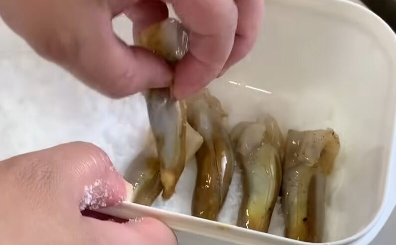 - バットに塩を薄く敷き、その上にワタを並べます。