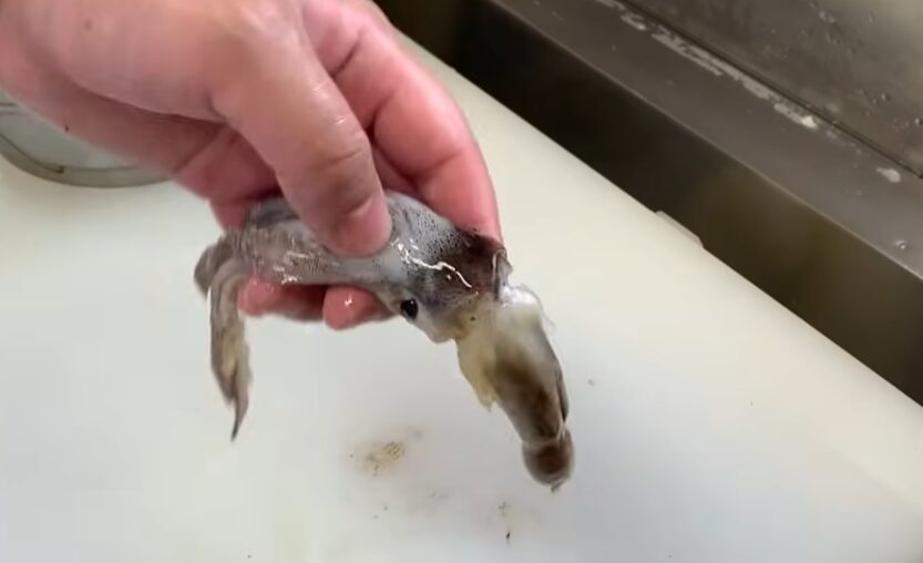 目の少し上あたりで包丁を入れ、足とワタを切り離します。ワタについている墨袋や余分な内臓はやさしく取り除く。三越伊勢丹の食メディア | FOODIE(フーディー) - 胴体を開いて皮をむく