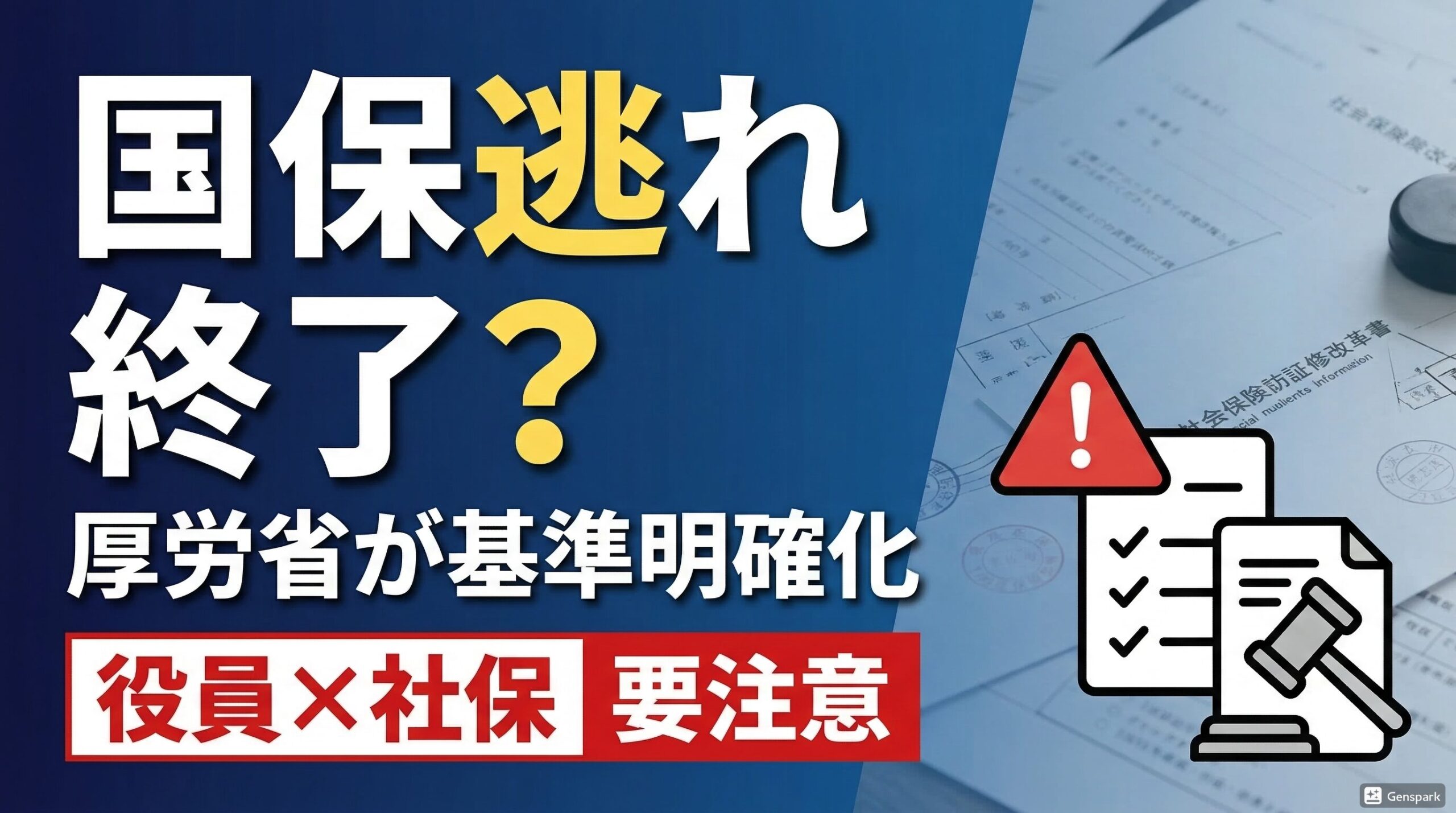 厚生労働省が “実態のない役員加入” を想定した被保険者資格の判断を明確化 する通知を出し、いわゆる「国保逃れ」的なスキームにブレーキがかかりました🛑 厚生労働省