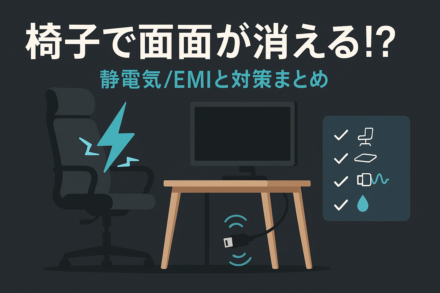 - 静電気(ESD): 乾燥した環境や化繊の座面・服で帯電→立つ/座る瞬間に放電。放電スパイクが映像信号の同期を乱すと瞬断が起きる。Super User+1