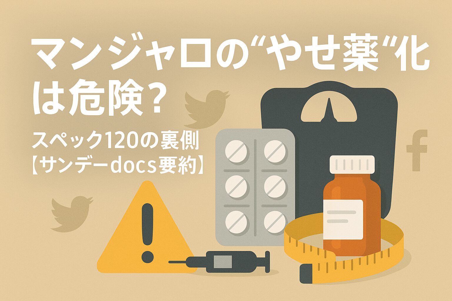 フジテレビのドキュメンタリー『サンデーdocs』が、2型糖尿病治療薬「マンジャロ(Mounjaro)」のダイエット目的での不適切使用を特集。SNSでは「打てば痩せる」と誤解を招く情報が広がり、短期で−10kg級の減量を追う若者たちや、**“スペック120”**という見た目偏重の理想に惹かれる声も紹介されました。一方で、栄養失調や体調不良、救急搬送例まで出ている現実が指摘されています。 TVer+2Instagram+2
