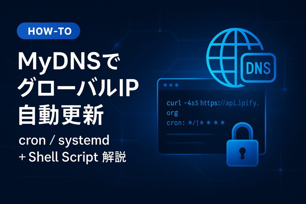 自宅回線(動的IP)でも、MyDNSを使えば独自のホスト名で外部公開が可能です。この記事では、**グローバルIPの変化を検知してMyDNSへ自動更新(ログイン更新)**するシェルスクリプトと、cron/systemdでの定期実行方法、安全に運用するためのポイントを解説します。