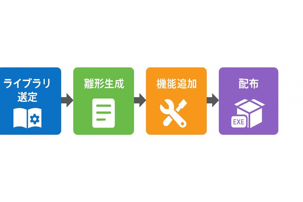 「ライブラリ選定 → 雛形生成 → 機能追加 → 配布」