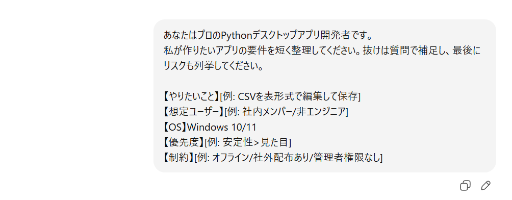 この記事では、ライブラリ選定 → 雛形生成 → 機能追加 → 配布の各フェーズでそのまま使える“完成度の高いプロンプト”を配布します。必要に応じてコピペして、角括弧[]だけ埋めてください。
