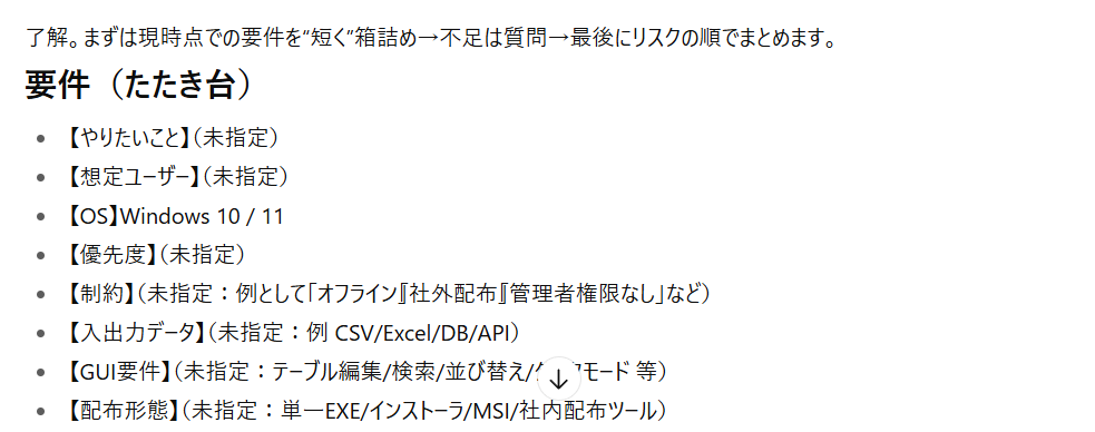 - 要件を短く決める → 比較表を出させる → 雛形を“全文”で出させる → 差分で機能追加 → exe
