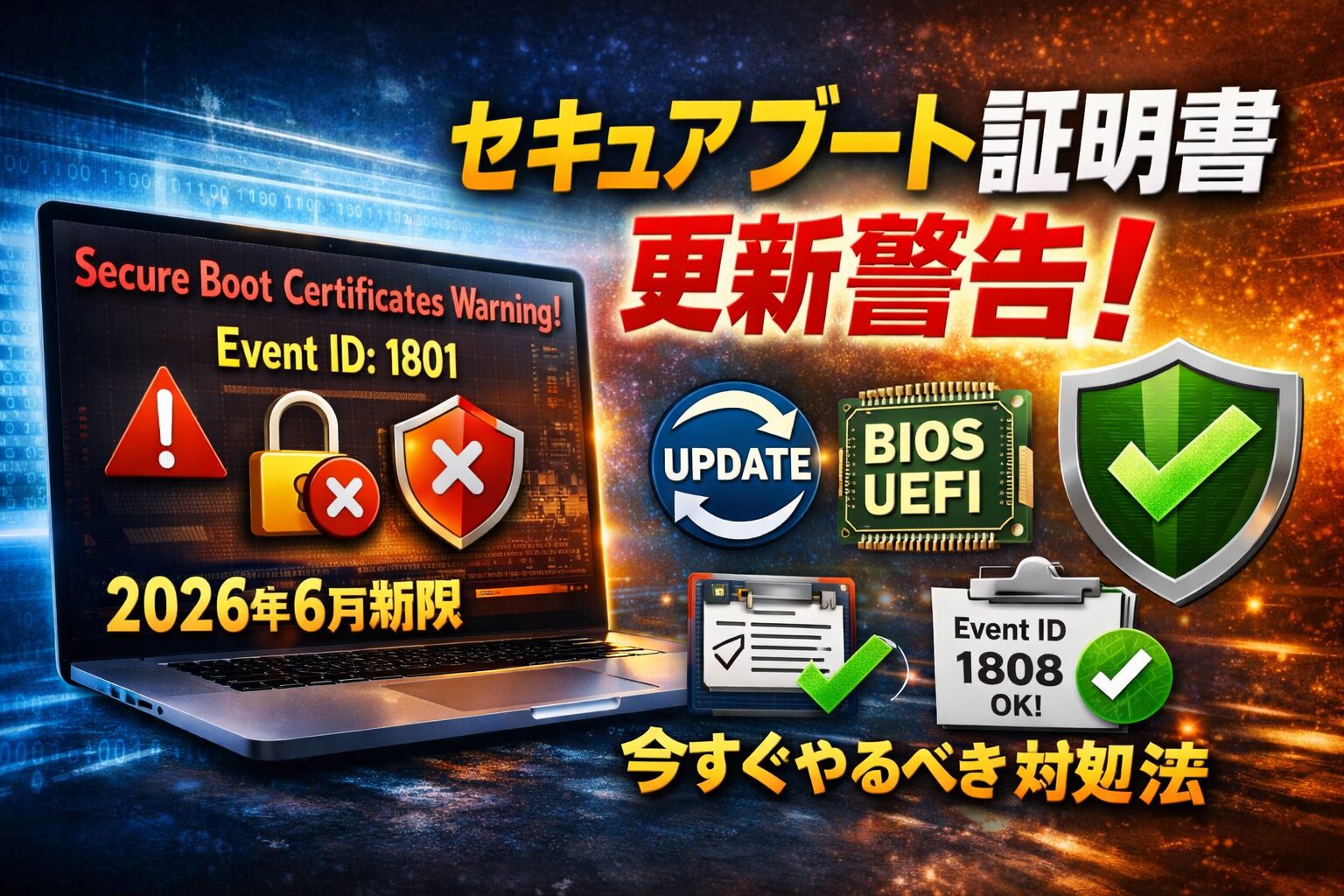 Event ID 1808(完了の情報イベント)や、UEFICA2023Status が "Updated" になっているかが目安です。🔍