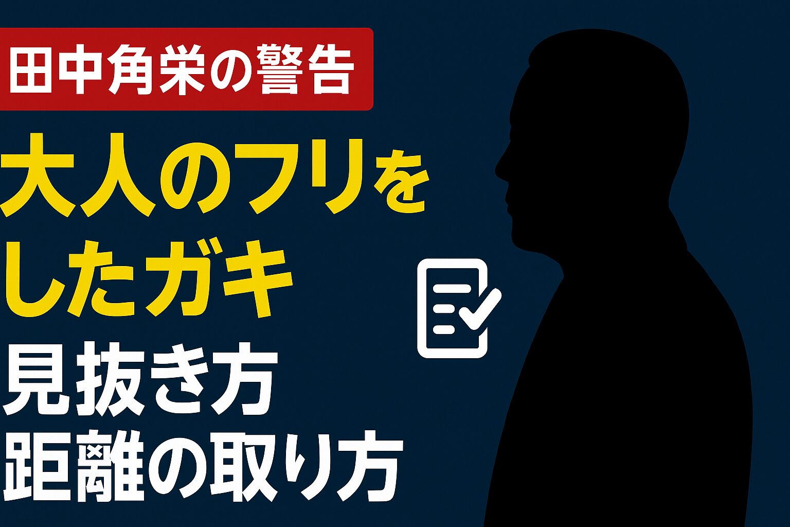 YouTube動画「【田中角栄の警告】『大人のフリをしたガキとは関わるな。』伝説の政治家が語る精神年齢の低い人間の見抜き方」を参考に、精神年齢が低い人に共通するサインと、関わり方の原則を、仕事・プライベート両面で使える形にまとめました。動画の要点を抽象化し、現場でそのまま使えるチェックリストと対処フローに落とし込んでいます。 YouTube