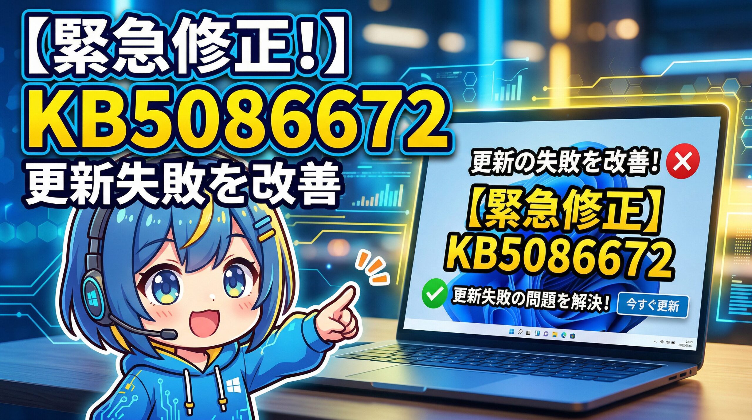 今回のKB5086672は、前回のプレビュー更新で発生していたインストール失敗問題を修正するための緊急パッチです🔧